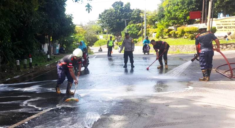 Atas laporan itu, UPT Damkar Bintan Utara mengerahkan personel dan satu mobil damkar melakukan pembersihan jalan.