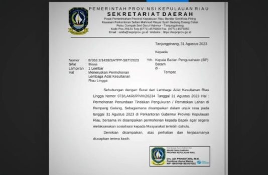 Surat itu lanjut Hasan,  hari ini juga, sudah dikirimkan Sekda Kepri ke Kepala BP.Batam dengan nomor:B/363.2/1428/SATPP-SET/2023 Perihal: Meneruskan Permohonan Lembaga Adat Riau Lingga yang ditandatangani Sekda Kepri Adi Prihantara.